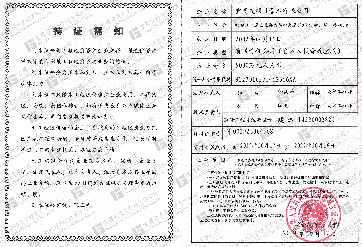 宜國發(fā)項(xiàng)目管理有限公司(原名黑龍江國發(fā)項(xiàng)目管理有限責(zé)任公司)成立于2002年4月,公司注冊資金5000萬元人民幣,具有獨(dú)立法人資格。現(xiàn)具備國家住房和城鄉(xiāng)建設(shè)部頒發(fā)的工程招標(biāo)代理機(jī)構(gòu)甲級資質(zhì),發(fā)展和改革委員會頒發(fā)的中央投資項(xiàng)目招標(biāo)代理機(jī)構(gòu)甲級資質(zhì)、財(cái)政部頒發(fā)的政府采購代理機(jī)構(gòu)甲級資質(zhì),黑龍江省住房和城鄉(xiāng)建設(shè)廳頒發(fā)的工程造價(jià)咨詢企業(yè)甲級資質(zhì),并已納入全國投資項(xiàng)目在線審批監(jiān)管平臺工程咨詢單位備案名單、“中國政府采購網(wǎng)”政府采購代理機(jī)構(gòu)名單及“中國國際招標(biāo)網(wǎng)”機(jī)電產(chǎn)品國際招標(biāo)代理機(jī)構(gòu)名單,且通過了質(zhì)量管理體系、環(huán)境管理體系、職業(yè)健康安全管理體系認(rèn)證。